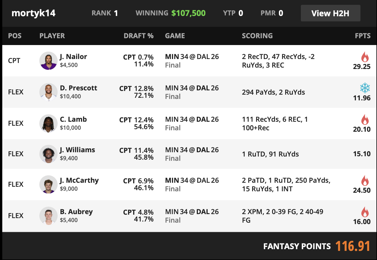 This win is built around a punt captain with a real ceiling outcome, not a dead slot. Nailor at captain is 0.7 percent ownership, yet he supplies two touchdowns plus enough yardage to beat many expensive captains. Once that happens, the rest of the roster becomes a salary allocation exercise.