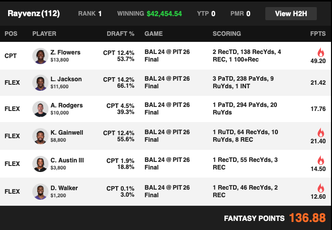 | CAPTAIN | Z. Flowers BAL WR | 12.4% | 13800 | 49.2 |